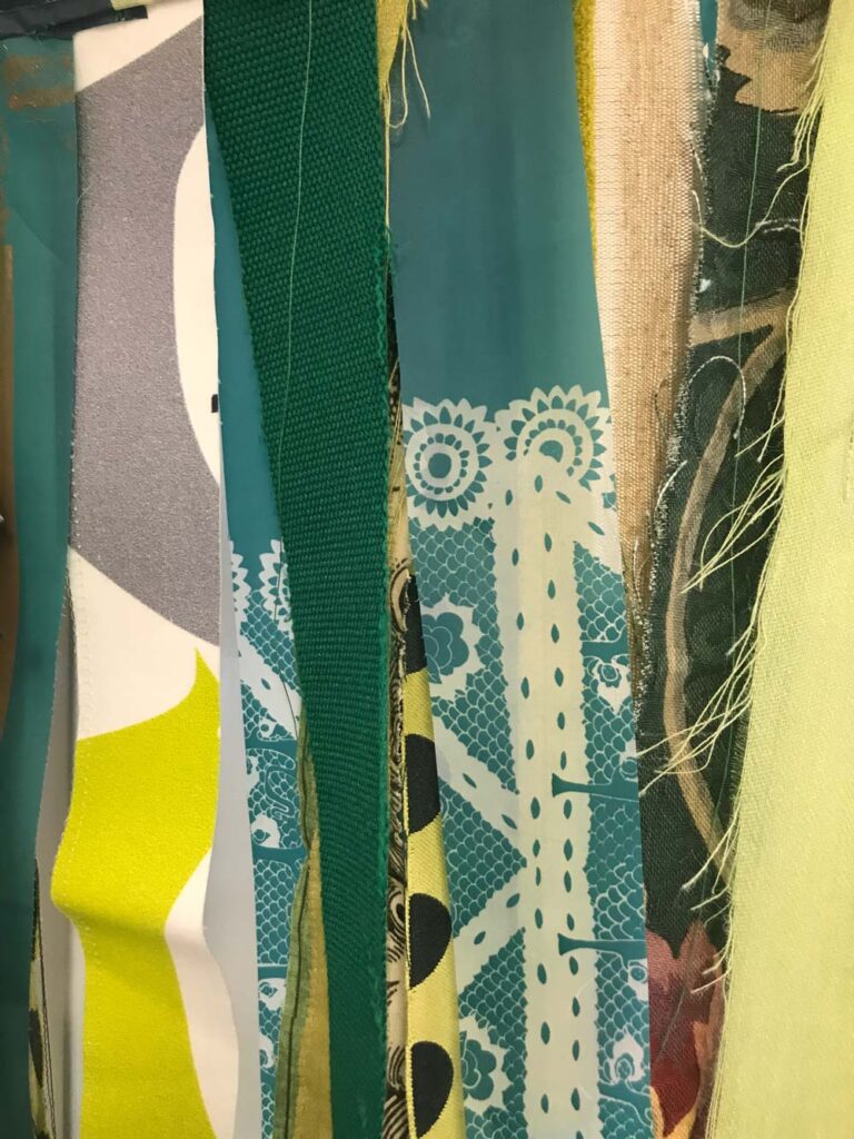 Reuse of screen-printed fabrics and textile screen materials to create new textile pieces (dresses, accessories, decorative objects).